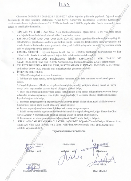 Arif Nihat Asya İlkokulu Servis Araçları Kiralama İş Tarifi ve Kiralama Esasları Duyurusu