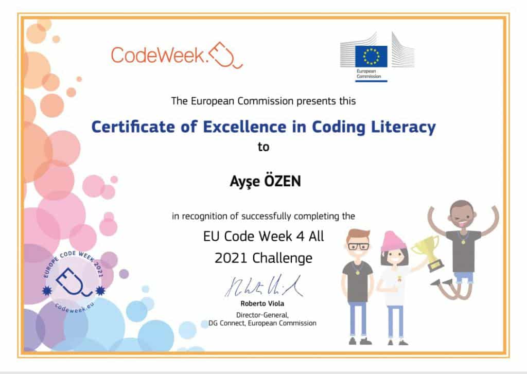2-H Sınıf Öğretmenimiz Ayşe Özen'in Avrupa Birliği ve Milli Eğitim Bakanlığı ortak projeler kapsamında aldığı Codeweek Sertifikası için kutlarız.